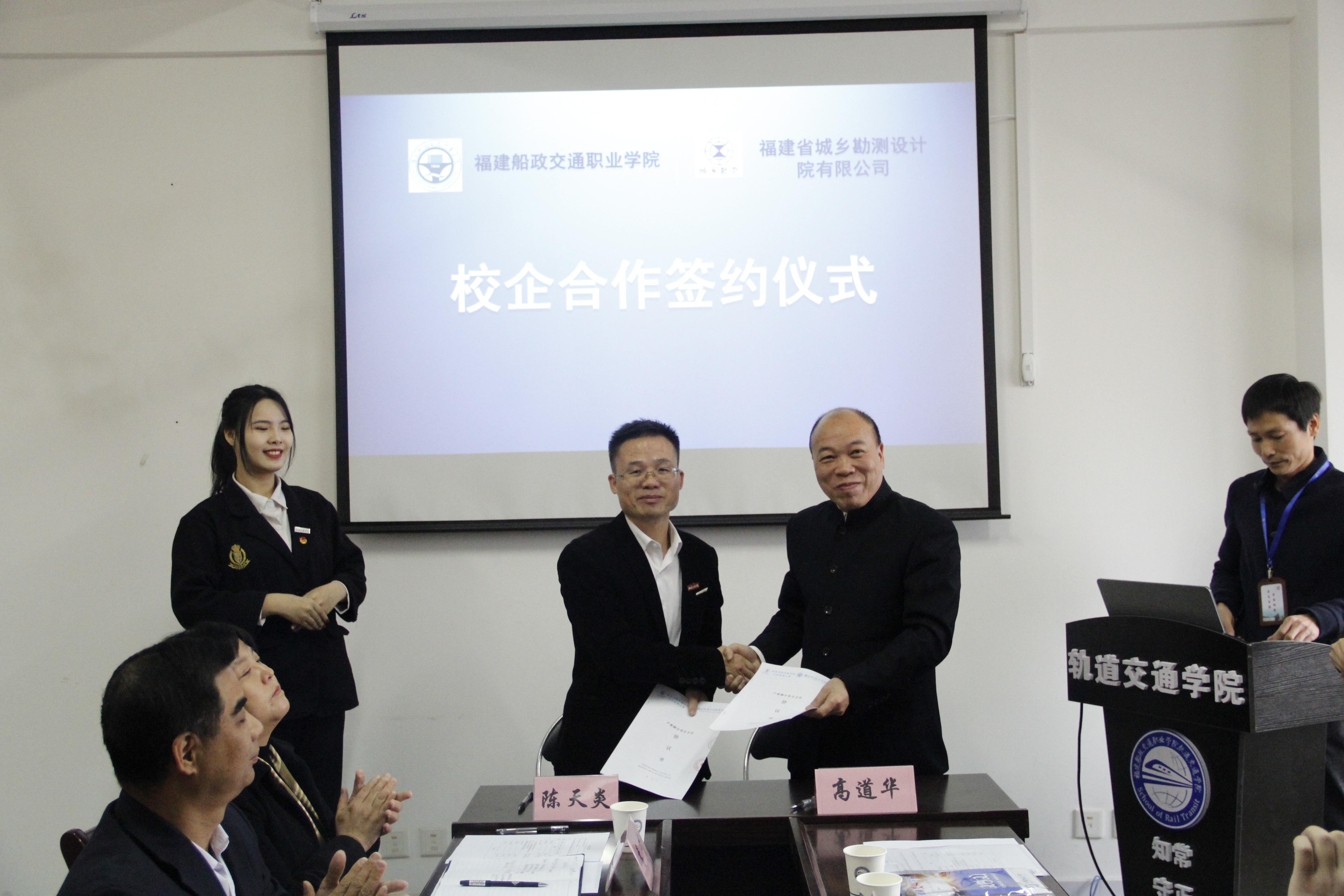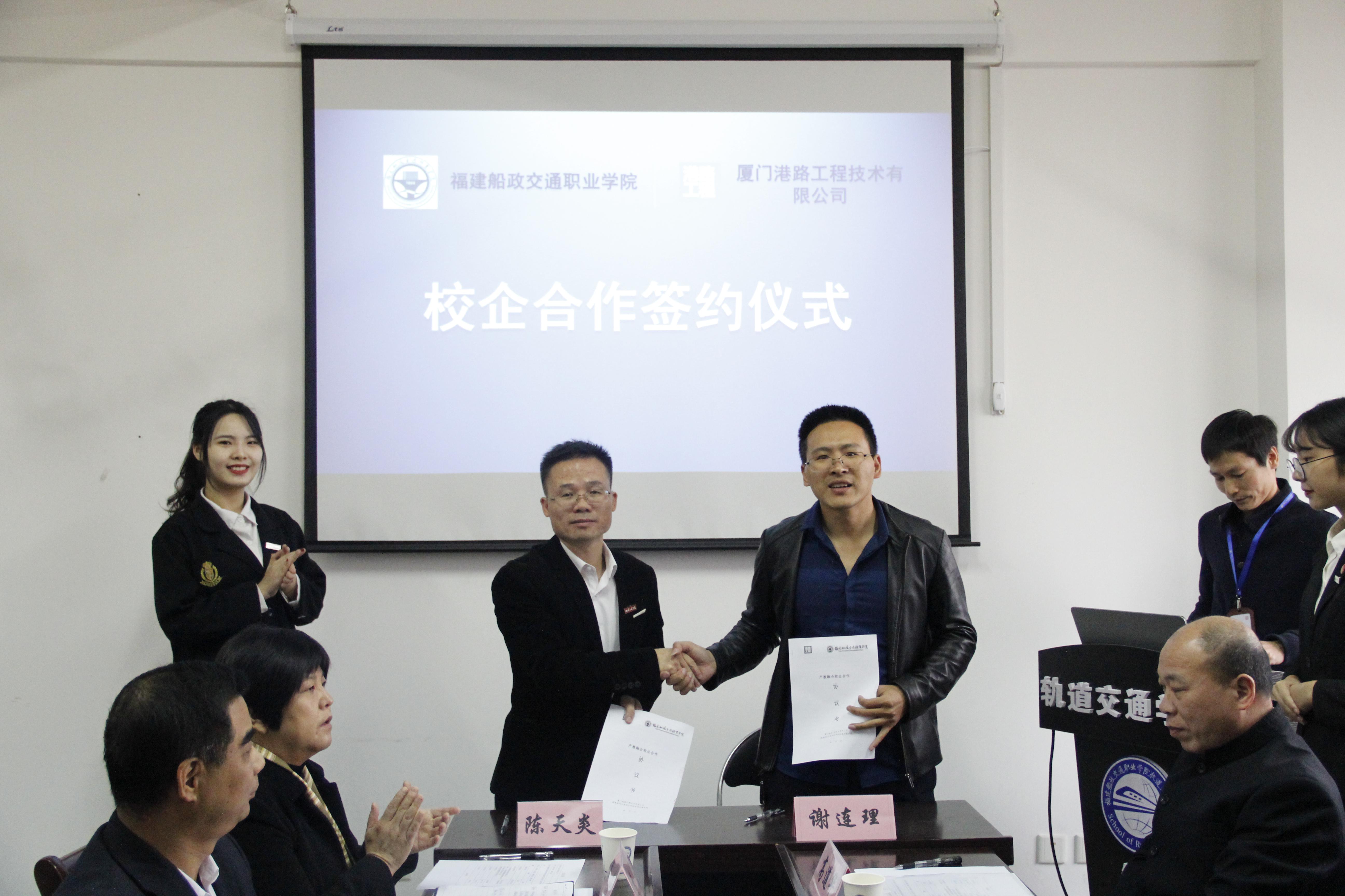随后举行了校企合作签约仪式,我院院长陈天炎代表轨道交通学院同广州南方测绘科技股份有限公司、中铁二十四局集团福建铁路建设有限公司、厦门港路工程技术有限公司、福建省城乡勘测设计院有限公司进行合作签约。