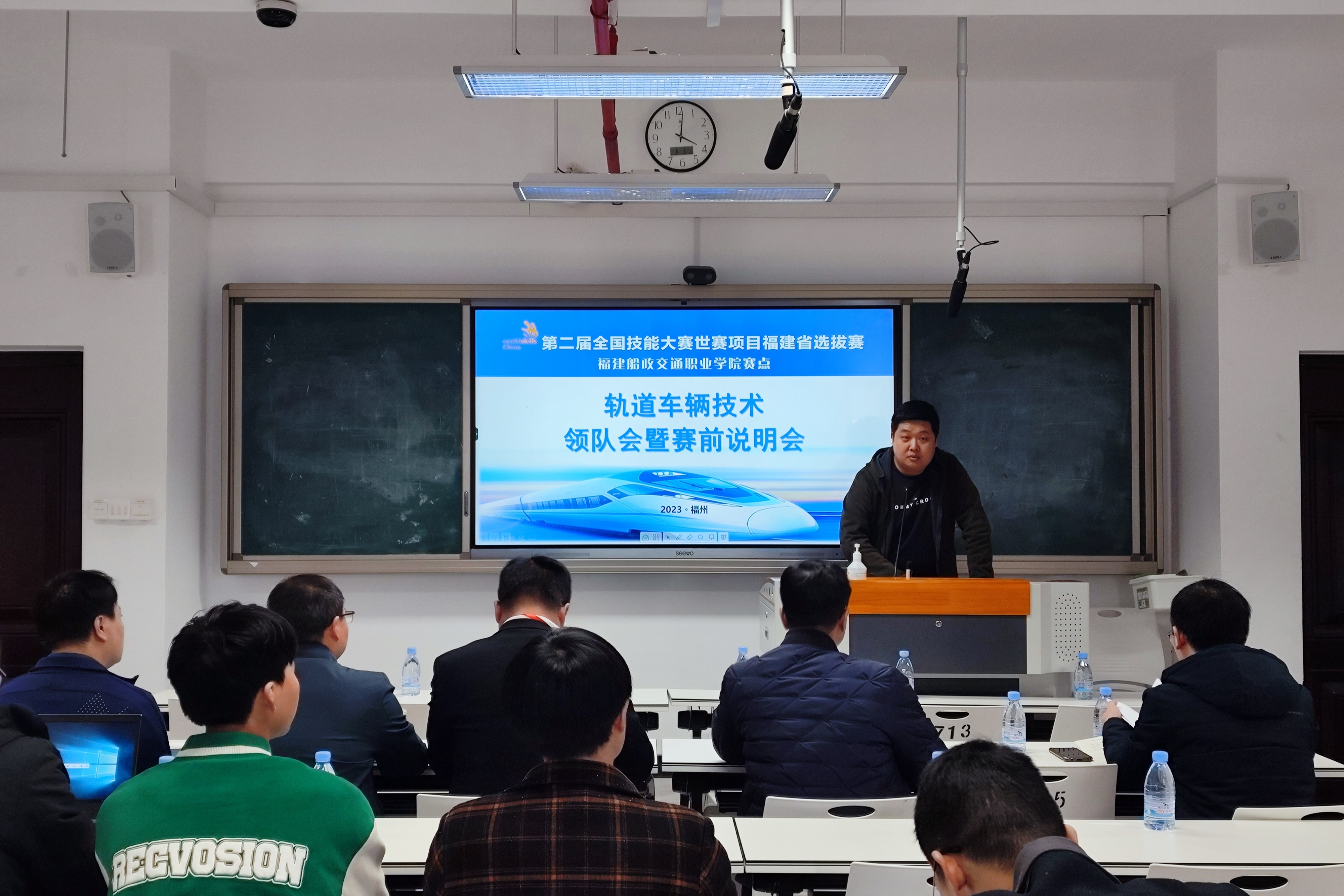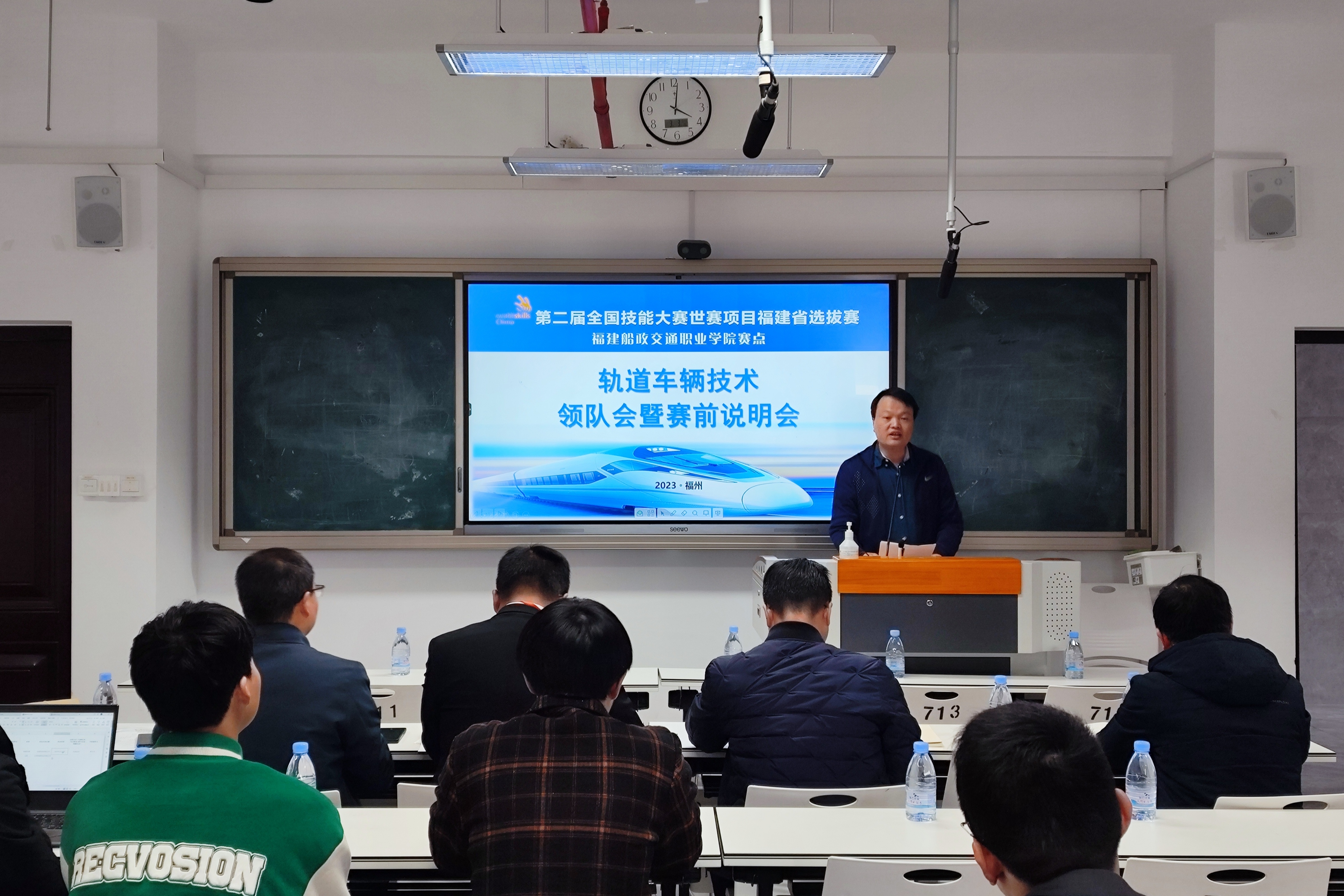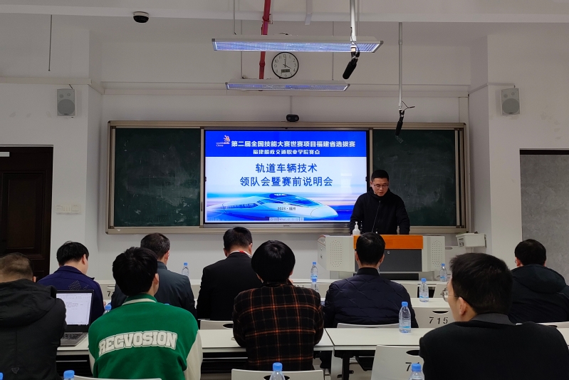 赛前说明福建船政交通职业学院轨道交通学院副院长陈宏意主持。内容包括参赛吃住行保障竞赛场地设施设备保障竞赛保密事项措施、解读竞赛要求和竞赛规程、选手场次抽签