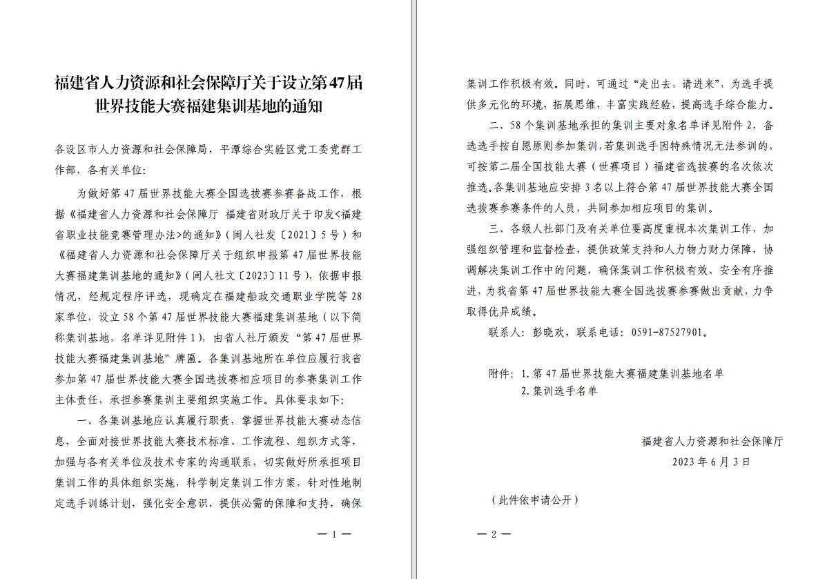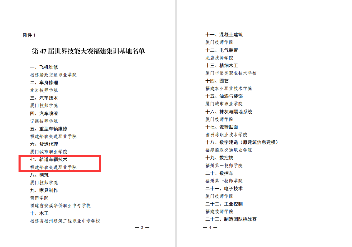 根据《福建省人力资源和社会保障厅福建省财政厅关于印发<福建省职业技能竞赛管理办法>的通知》(闽人社发〔2021〕5号)和《福建省人力资源和社会保障厅关于组织申报第47届世界技能大赛福建集训基地的通知》(闽人社文〔2023〕11号)文件,我院入选第47届世界技能大赛“轨道车辆技术”赛项福建集训基地。