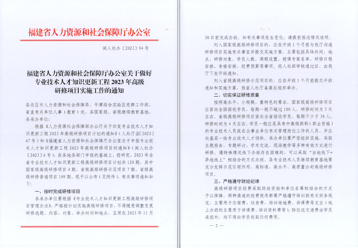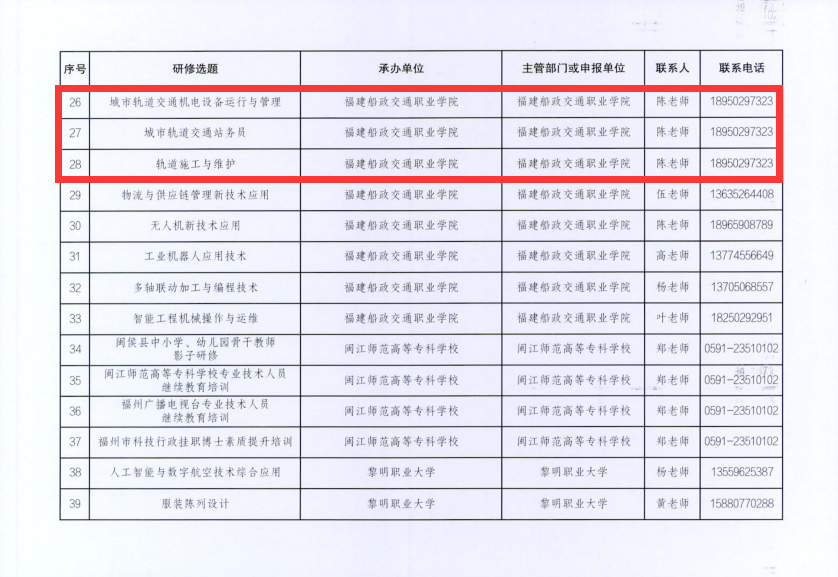 近日,福建省人力资源和社会保障厅办公室发布了《关于做好专业技术人才知识更新工程2023年高级研修项目实施工作的通知》(闽人社办〔2023〕94号)公布了2023年全省专业技术人才知识更新工程高级研修项目计划。我院申报的《城市轨道交通机电设备运行与管理》等3个项目成功获批省级项目。