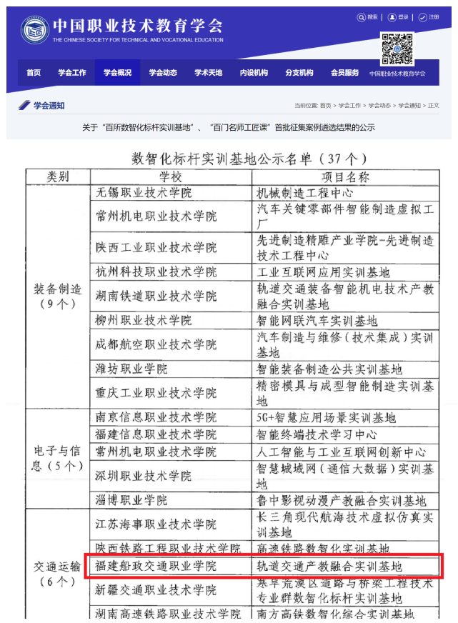 近日,中国职业技术教育学会发布《关于“百所数智化标杆实训基地”、“百门名师工匠课”首批征集案例遴选结果的公示》,我校轨道交通学院“轨道交通产教融合实训基地”成功入选全国首批“百所数智化标杆实训基地”。