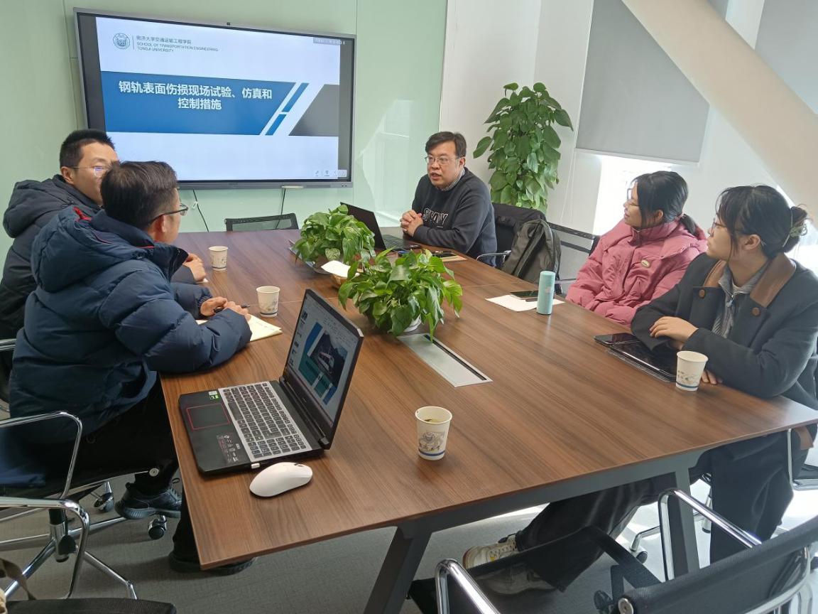 陈天炎院长听取了周宇教授团队在钢轨损伤演化机理、智能识别以及养护技术方面的研究报告,介绍了我院目前在研的钢轨裂纹识别项目的研究思路和进展,表示今后要加强合作,共同开展钢轨相关领域的研究,推动双方联合开展跨学院的项目合作。