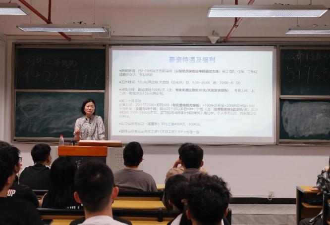 随后,主讲人详细介绍了各个岗位的具体工作内容,分别是巡视检查站内设施的厅巡,解答乘客疑问的客服中心和处理突发事件的站台。同时,主讲人还介绍了工作的时间为轮班制,以及员工宿舍和夜班福利。在宣讲会的最后,主讲人介绍了薪资构成以及员工福利。
