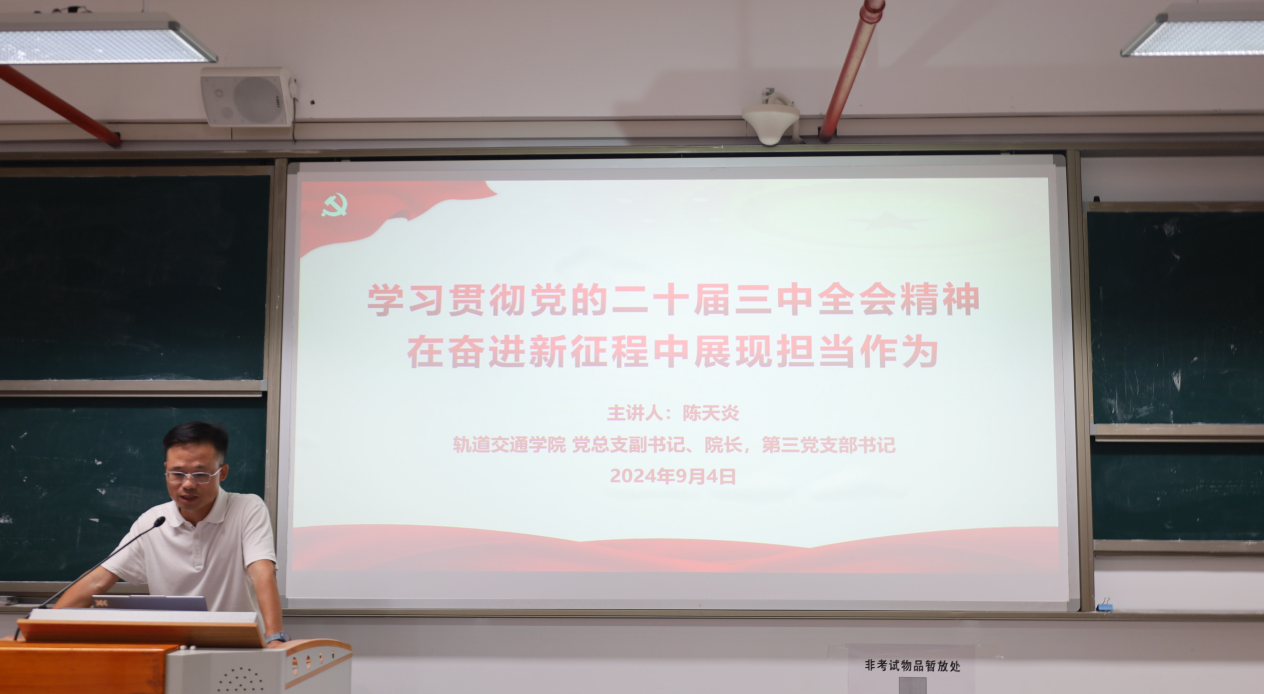 为全面深入学习贯彻党的二十届三中全会精神,扎实推进学习宣传贯彻工作。9月4日,轨道交通学院第三党支部开展学习贯彻党的二十届三中全会精神宣讲会。轨道交通学院党总支副书记、院长、第三党支部书记陈天炎作《学习贯彻党的二十届三中全会精神,在奋进新征程中展现担当作为》专题宣讲,全体党员教师及城轨机电技术专业学生120多人参加本次宣讲交流会。