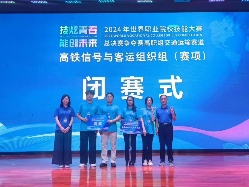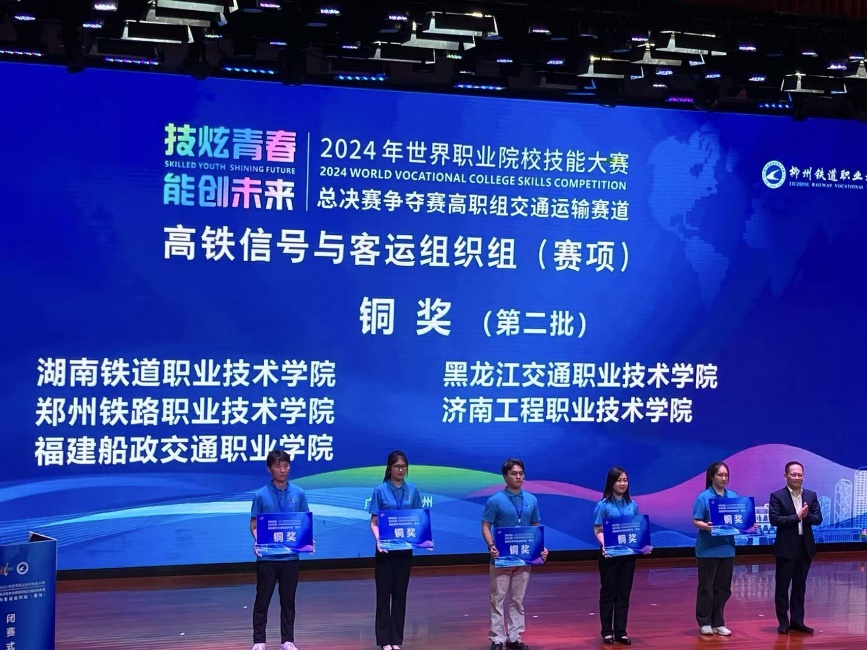 1027-1030日,2024年世界职业院校技能大赛总决赛争夺赛高职组交通运输赛道高铁信号与客运组织赛项在柳州铁道职业技术学院举行。来自全国31个省、市、自治区的52支代表队,共207名选手参加同台竞技,福建船政交通职业学院轨道交通学院李强、彭溢、黄恒攀、黄雪莹组成的参赛团队在总决赛中荣获铜奖。