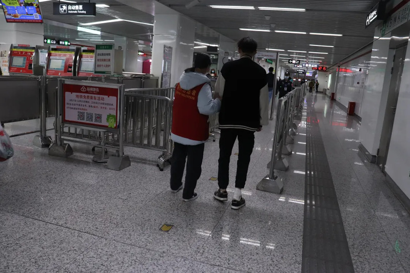 志愿者们对有大件行李的旅客进行行李分担,引导他们走垂直电梯,排除安全隐患,志愿者还对盲人旅客进行专人引导,保证盲人也能像正常人一样,享受地铁的便捷。