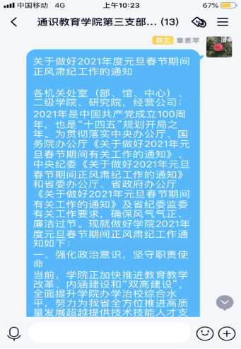 为加强廉政建设,持之以恒正风肃纪,严明廉洁过节各项纪律要求,根据学校纪委办通知精神,通识教育学院以支部党员大会、教研室例会等形式,组织广大党员和教师认真学习了学校纪委办公室《关于做好2021年度元旦春节期间正风肃纪工作的通知》。主要采用线上加线下相结合方式进行学习,通过学习,进一步提高了政治站位,强化了底线意识,提升以身作则知止敬畏的行动自觉,进一步增强作风建设的自觉性和坚定性。党员和教师均表示要以更高标准、更严要求落实中央八项规定精神、纠治“四风”,以风清气正的良好氛围为新阶段作风建设开好头、起好步;坚决杜绝形式主义,官僚主义,认真学习省纪委公开曝光的“四风”典型问题,严守纪律,坚持“纠四风”、树新风,进一步强化以人民为中心的服务理念,主动服务基层,服务师生;努力营造崇廉尚俭的节日氛围,确保务实、节俭、文明、清廉过好“两节”。