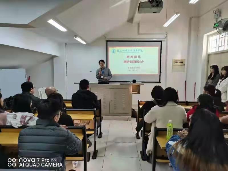 12月1日下午,通识教育学院在体育教研部教室召开师德团队专题研讨活动,通识教育学院师德师风建设团队出席,各二级学院学生代表参加,会议由通识教育学院金晶晶副院长主持。金晶晶、曾雅琴、沈焰焰、甘媛、吴婷婷、黄爱梅、林佳丽、闫建瑞、许贵福、赵少杰等团队教师先后交流发言,介绍教师职业生涯成长经历,分享师德学习体会和感悟。