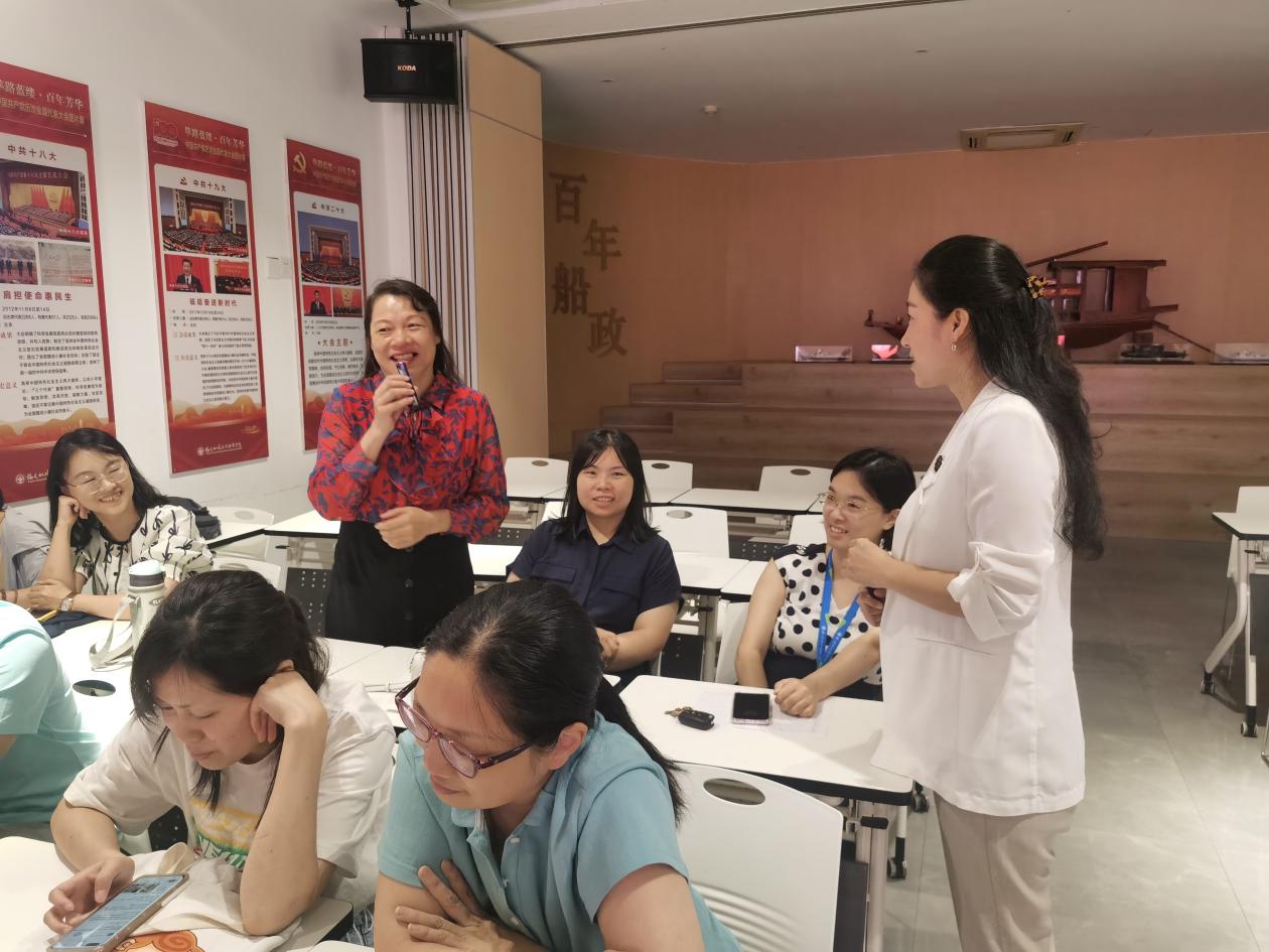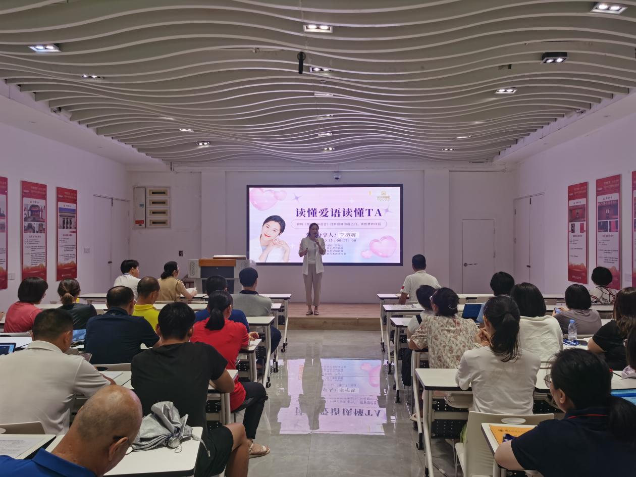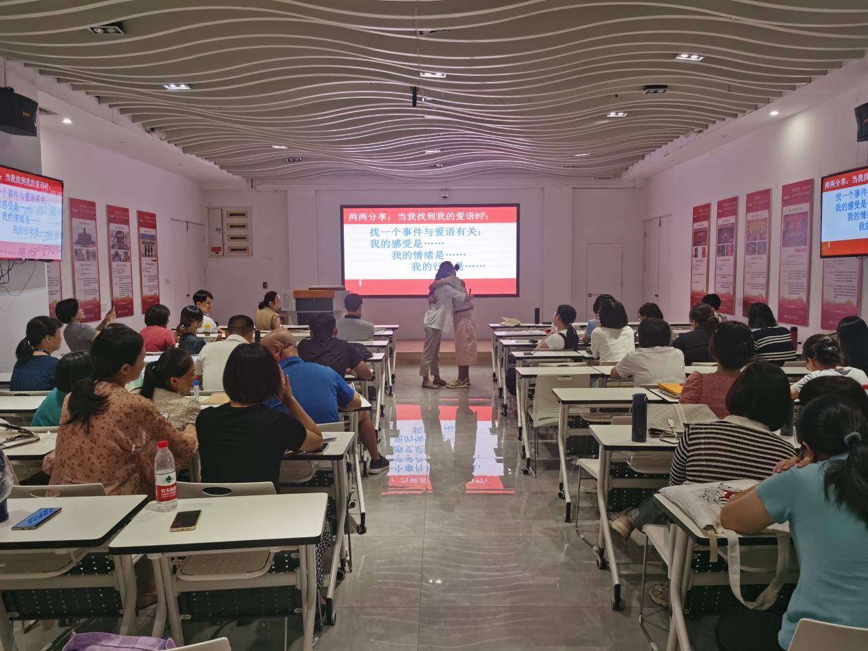 课上,李榕辉老师从教师心理健康出发,结合生动的案例和自身经历,介绍家庭亲子沟通的重要性、意义和途径,重点阐述了肯定的言词、精心的时刻、接受礼物、服务的行动和身体的接触等“爱的五种语言”,以及具体表达方式。现场气氛活跃,李榕辉开展多次互动游戏、测试、冥想母爱之光等活动,有效教师们打开良好沟通之门,提高与家人沟通的质量。老师们纷纷表示,培训课氛围感好,实用性强,工作离不开家庭,离不开良好的亲子关系,从培训课中学会了实用亲子表达沟通的方式和技巧。