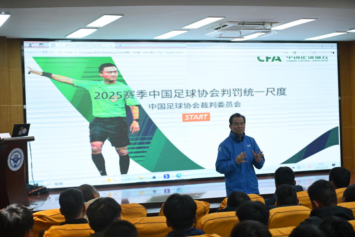 开幕式后国际足联、亚足联、中国足协讲师,前亚洲金旗刘铁军老师为全体学员讲解2025中国足协各级比赛统一尺度,刘铁军老师理论与视频相结合,为学员们解疑答惑。下午全体裁判员在实践课讲师王长其、王发振、温从明、程伟的带领下,进行了裁判员跑位和助理裁判员旗示练习。