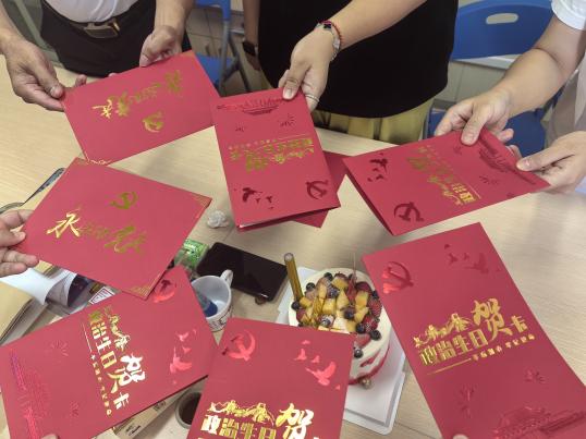 活动伊始,支部书记为党员教师赠送“政治生日贺卡”。贺卡印刻入党誓词与党员入党日期,传递组织关怀与责任嘱托。接着,党员教师面对党旗重温宣誓,铿锵誓言响彻会场。随后,支部通过活动深化党员身份认同,现场洋溢着“组织温情”与“红色力量”的交融共鸣。