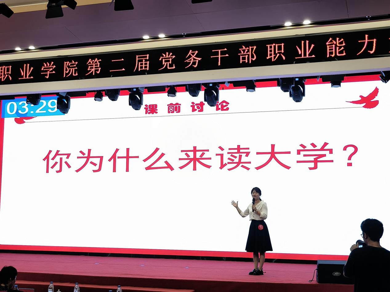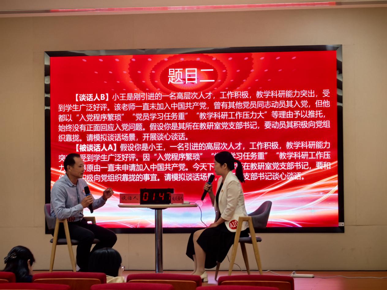本届大赛自10月启动以来,先后完成了“主题党日策划”与“党务知识测试”两项赛程。10月22日于艺新楼进行的“谈心谈话”与“微党课”环节中,通识教育学院代表队与各二级学院优秀党务干部同场竞技,展现出扎实的党务功底与职业素养。