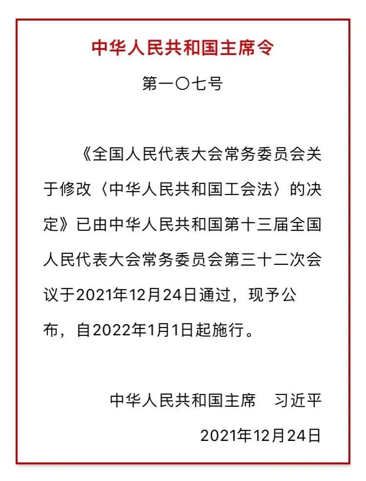 1992年4月3日第七届全国人民代表大会第五次会议通过 根据2001年10月27日第九届全国人民代表大会常务委员会第二十四次会议《关于修改〈中华人民共和国工会法〉的决定》第一次修正 根据2009年8月27日第十一届全国人民代表大会常务委员会第十次会议《关于修改部分法律的决定》第二次修正 根据2021年12月24日第十三届全国人民代表大会常务委员会第三十二次会议《关于修改〈中华人民共和国工会法〉的决定》第三次修正)