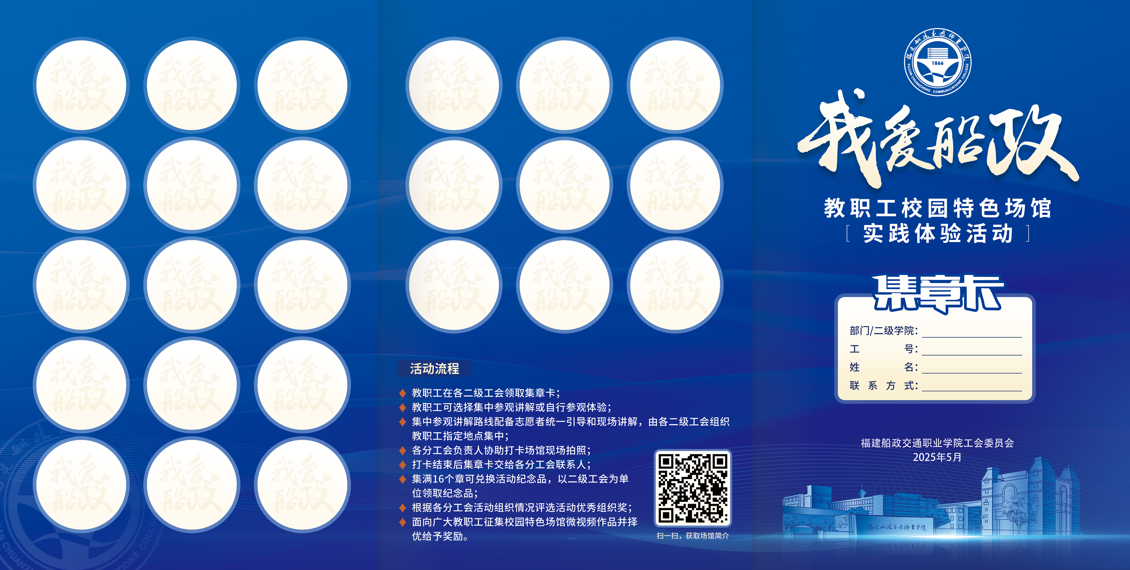 为团结凝聚广大教职工充分感受学院职教特色和办学成果,激励广大教职员工爱校爱家、团结奋斗追求卓越,为学院高质量发展做出新的更大贡献。学院工会联合各二级工会,共同开展“我爱船政”教职工校园特色场馆实践体验活动,现将活动具体安排通知如下: