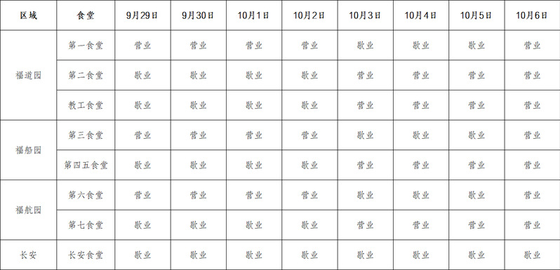 根据学院中秋国庆放假通知,结合学院各食堂设备检修及环境消杀安排,学院各食堂开餐情况如下表,请各单位及时通知到师生。