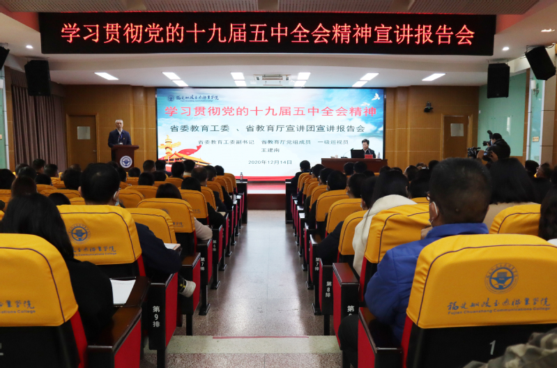 12月14日上午,省委教育工委、省教育厅学习贯彻党的十九届五中全会精神宣讲报告会在我院北校区一号楼六楼学术报告厅举行。省委教育工委、省教育厅“百人宣讲团”成员、省委教育工委副书记,省教育厅党组成员、一级巡视员王建南作宣讲报告。学院在家领导、副科级以上干部、两级理论学习中心组成员、全院正高级教师、马克思主义学院教师、全体辅导员、各党总支委员及支部委员、各民主党派支部委员、习近平新时代中国特色社会主义思想读书社、船政青年求是社成员等近360余名师生聆听了宣讲报告。学院党委书记张海明主持报告会。