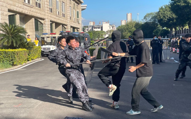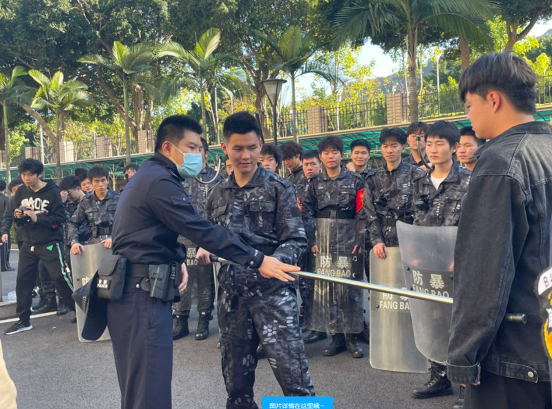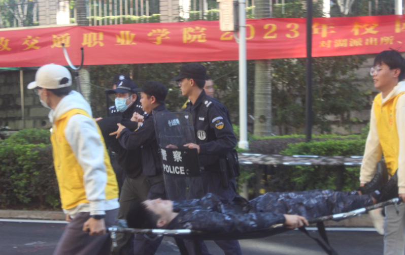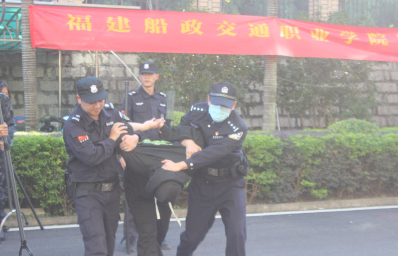 此次演练由学院联合福州市公安局仓山分局对湖派出所共同举办。演练内容包括暴恐事件的预防、应对和恢复等环节。演练开始前,对湖派出所警官对保安棍、防暴盾牌等安保器材作了详细的使用方法说明,随后演练有恶势力人员手持刀具硬闯入校园,在安保人员和110联动总队成员的共同努力下被成功捉拿;同时也模拟对受伤人员实施救助,开展现场的初步清理和恢复工作。演练结束后,对湖派出所警官对演练作了总结。