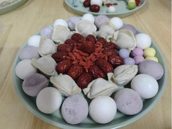 教师们和同学们围坐一起聊冬至习俗、品尝着热气腾腾的汤圆、馅多皮薄的饺子,脸上洋溢着幸福的微笑。