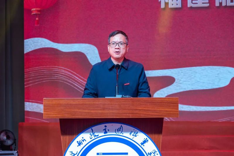陈宜大同志发表新年贺词,他感谢了全校师生在2023年取得的成绩并圆满完成了学院的各项建设任务,寄语学院和职教事业蒸蒸日上、前程锦绣。