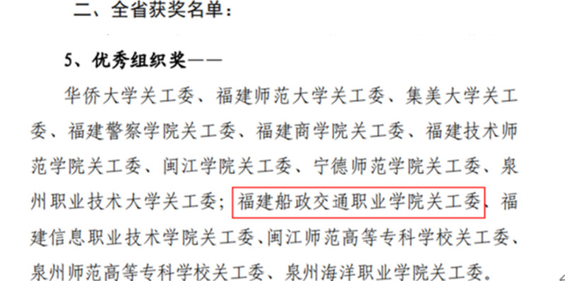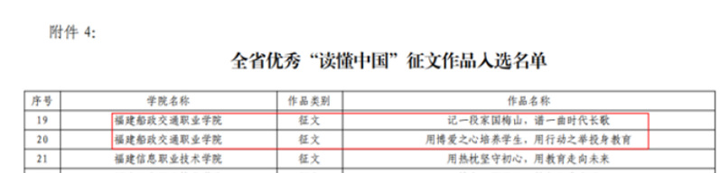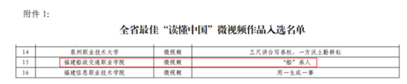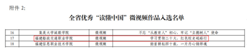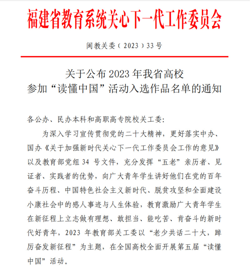日前,福建省教育系统关工委公布了2023年我省高校参加“读懂中国”活动入选作品名单,我院关工委荣获全省优秀组织奖,微视频《“船”承人》成功入选全省最佳“读懂中国”微视频作品,《学习贯彻二十大,红色校史砥砺行》荣获全省优秀“读懂中国”微视频作品,2篇学生征文入选全省优秀征文作品。