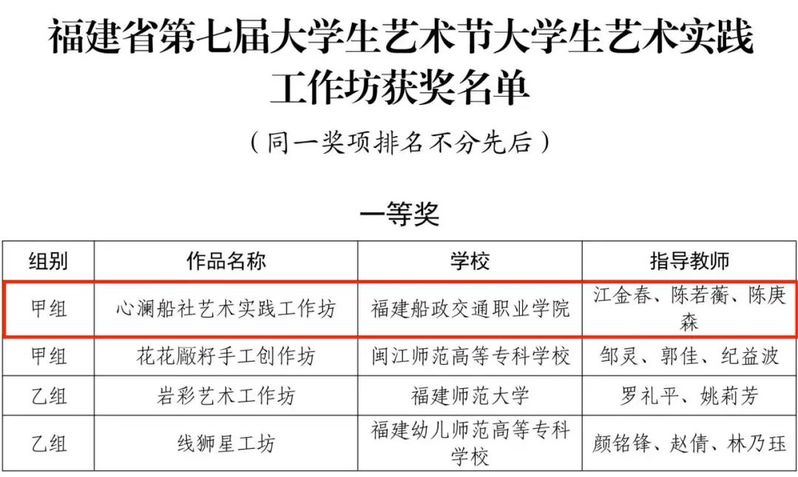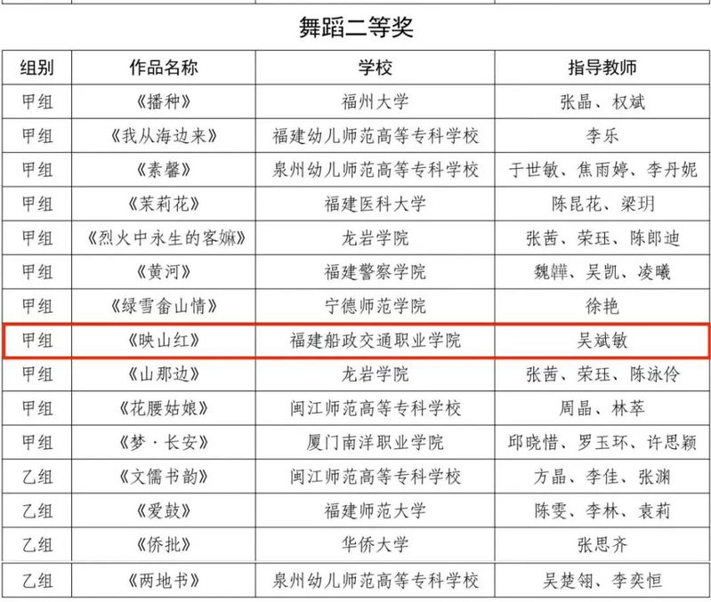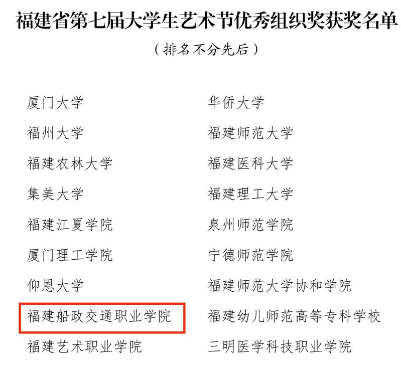 福建省第七届大学生艺术节展演活动获奖名单近日公布。大艺展由福建省教育厅主办,三年举办一次,本届艺术节以“厚植家国情怀,涵养进取品格”为主题。我院精心准备,选送了4个项目参加福建省第七届大学生艺术节展演,斩获6项荣誉,其中一等奖1项并入围国赛角逐,二等奖2项,三等奖1项,学院荣获优秀组织奖,1位学生获个人专项奖。