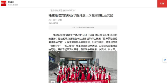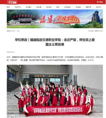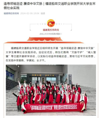 学院认真落实福建省委教育工委要求,统筹部署、协同开展“追寻领袖足迹 赓续中华文脉”大学生寒假社会实践,成立社会实践队,走进严复故居、严复博物馆等场所,开展“文脉守护”“闽人智慧”等主题开展研学活动,把“小我”融入到“大我”,在社会实践中坚定前行方向、找准人生坐标、扛起责任担当。本次主题社会实践活动得到学习强国福建学习平台、福建高校思政网、新福建等多家媒体报道,取得了良好的育人成效和社会认可。