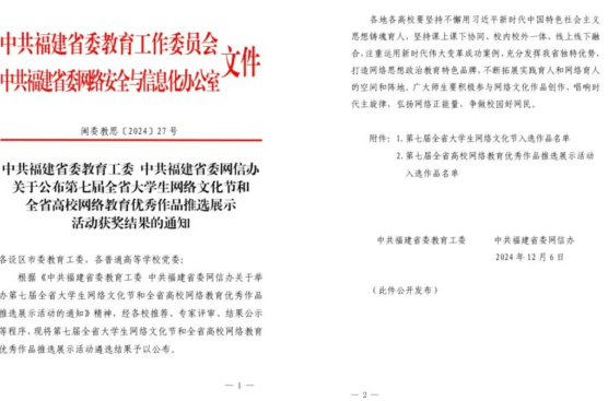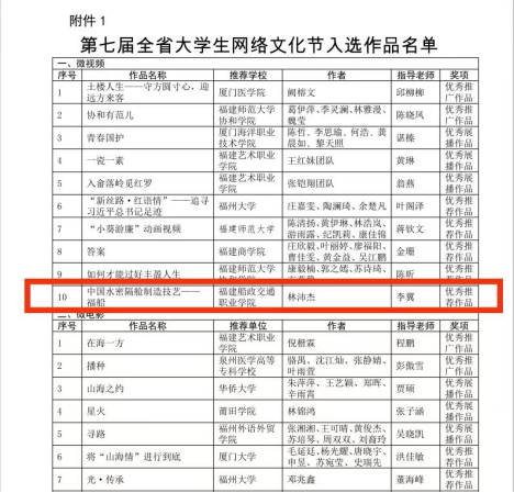 日前,中共福建省委教育工委、中共福建省委网信办公布第七届全省大学生网络文化节和全省高校网络教育优秀作品推选展示活动获奖结果。由我院航海学院林沛杰同学创作的微视频《中国水密隔舱制造技艺——福船》获微视频类别“优秀推荐作品”奖项。