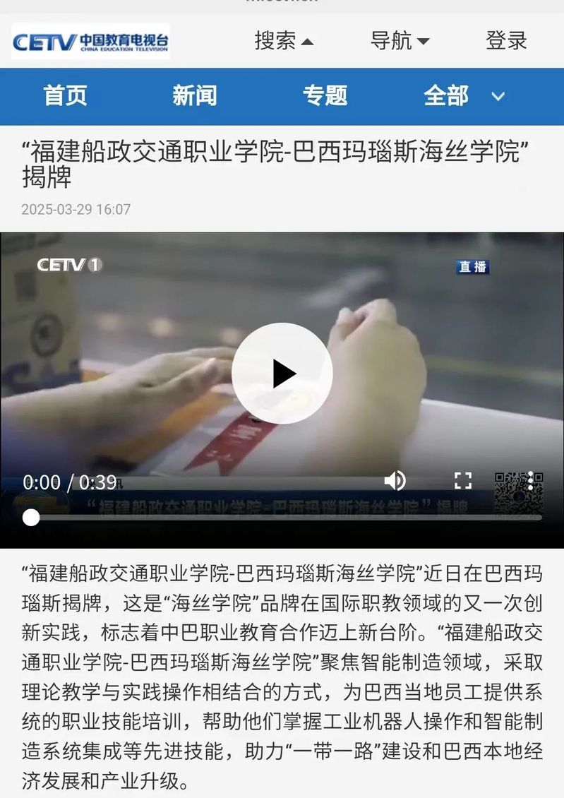 3月29日,中国教育电视台报道我院在巴西设立“海丝学院”,标志着中巴职业教育合作迈上新台阶。正文如下: