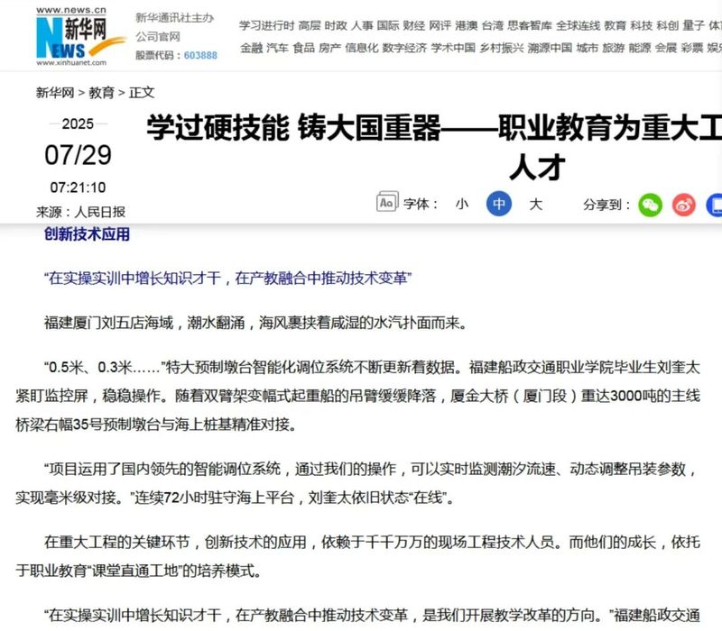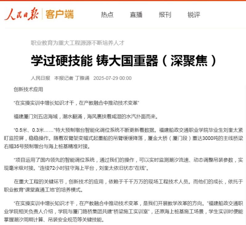 7月29日,人民网、新华网、光明网中国网等中央主流媒体报道我院毕业生刘奎太参与厦金大桥(厦门段)建设,展现学院在产教融合育人方面所取得的显著成效。具体报道情况如下: