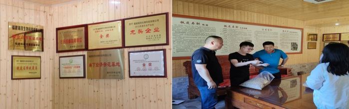 第二站小分队来到了南靖县山城镇下碑村,这里是烽琳股份有限公司所属的最早的种植基地——下碑基地。烽琳公司这几年来的硕果累累,从最初200来亩的荔枝林下种植发展到拥有910亩生态种植园,公司墙上挂满了的荣誉成果。这些成果也伴随着部分贫困农户走上了脱贫的道路。同时烽琳公司也非常重视党建文化,建有支部委员会,2019年还被南靖县委评为四星级党组织。据介绍,公司党员在农民脱贫工作中起模范带头作用。