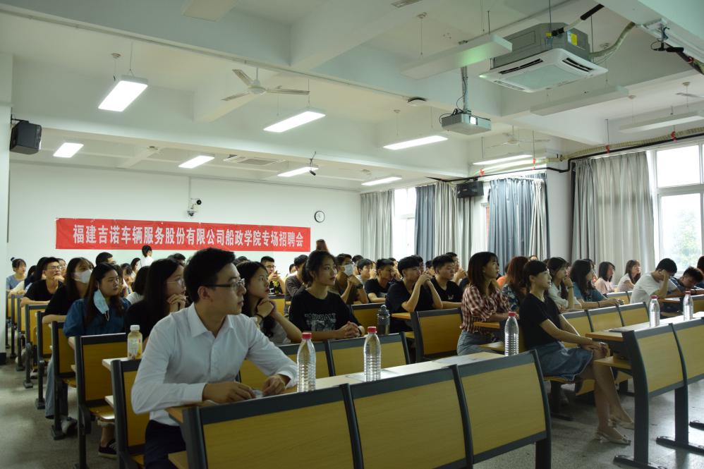 据悉,目前吉诺救援直营网络已覆盖福建、北京、上海、等 17 个省市,500 多个城市,是中国最大的汽车道路救援实体企业,每年成功处理超过 230 万个救援案件。秉持着“为客户提供更加卓越、高效、安全的服务,创造更多价值”的理念。本次宣讲会中,刘伟彪总监将竞聘岗位一一介绍,将招纳近70名优秀同学加入吉诺。并且举例了90年代在船政学习时的奋斗的故事,令听讲同学振奋人心。
