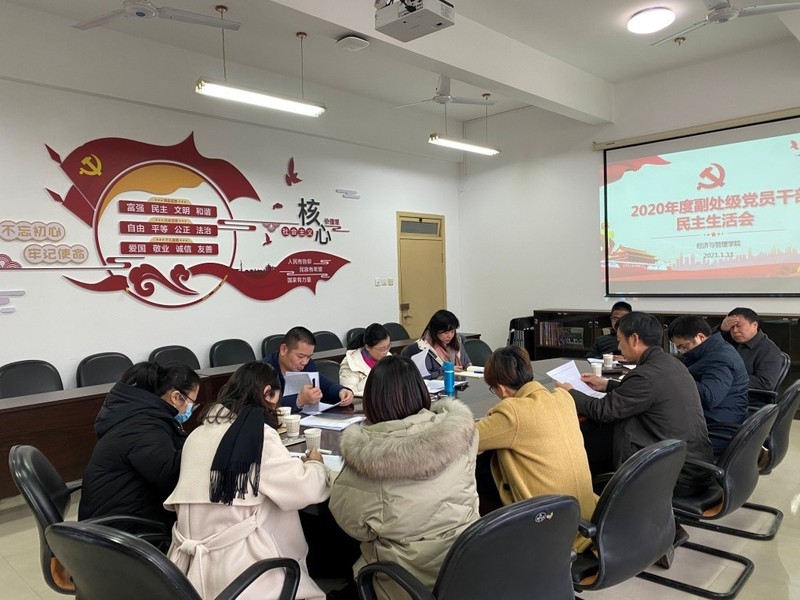 根据学院党委的工作部署,2021年1月11日下午,经济与管理学院副处级领导干部民主生活会在31号楼412召开。学院民生活会督导组组长院党委委员、副院长陈艳红,督指导组联系人院纪委副书记余土水,督导组成员院党政办副主任林品、院党委组织部林倩茜到会指导。经济与管理学院党总支书记俞素平、院长房曰荣、副书记林丽萍、副院长林颖、副院长吴吉明、副处级组织员黄瑞秋、分团委书记傅一丹及工作人员卢晓芬参加民主生活会。会议由经管学院党总支书记俞素平主持。