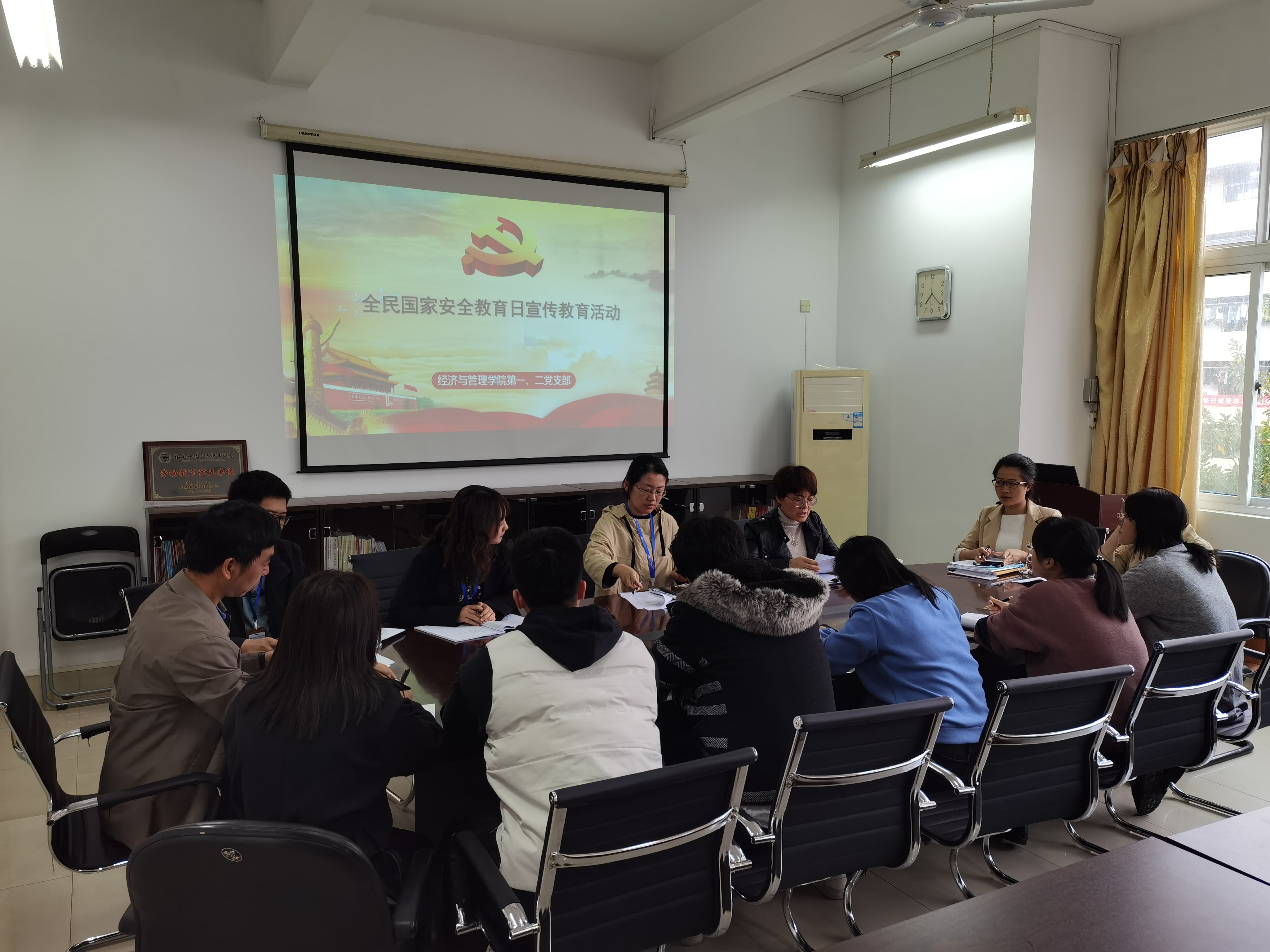 4月14日,在第六个国家安全教育日到来之际,为深入学习贯彻习近平法治思想,不断增强师生的国家安全意识和法治意识,有效引导师生切实筑牢总体国家安全观,经济与管理学院第一、第二党支部组织召开专题会议,对2021年全民国家教育日宣传教育活动进行安排部署。