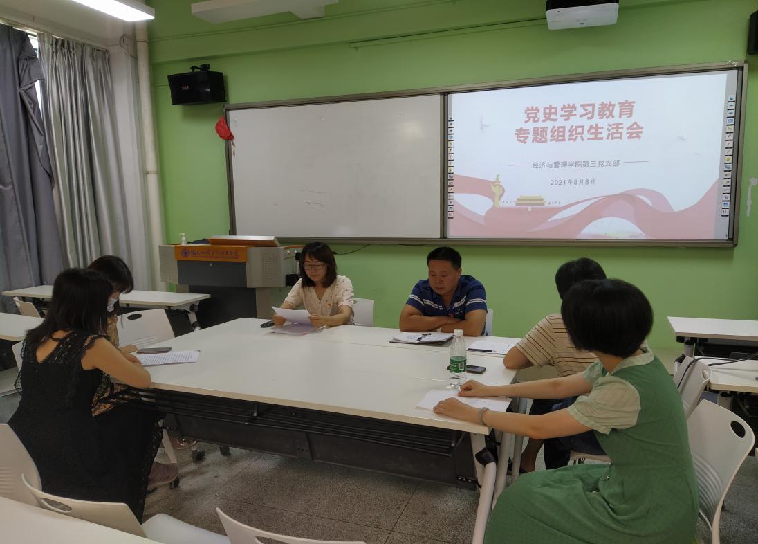 为激励支部全体党员从党的历史中汲取砥砺奋进的精神力量,进一步强化党史学习教育成效,根据《中共福建省委办公厅关于认真学习贯彻习近平总书记在庆祝中国共产党成立100周年大会上的重要讲话的通知》、《福建省教育系统党史学习教育领导小组办公室转发中共福建省委党史学习教育领导小组办公室关于召开党史学习教育专题组织生活会的通知》等文件精神,2021年8月8日,经济与管理学院第三党支部召开支部党史学习教育专题组织生活会,支部全体党员参加了会议。