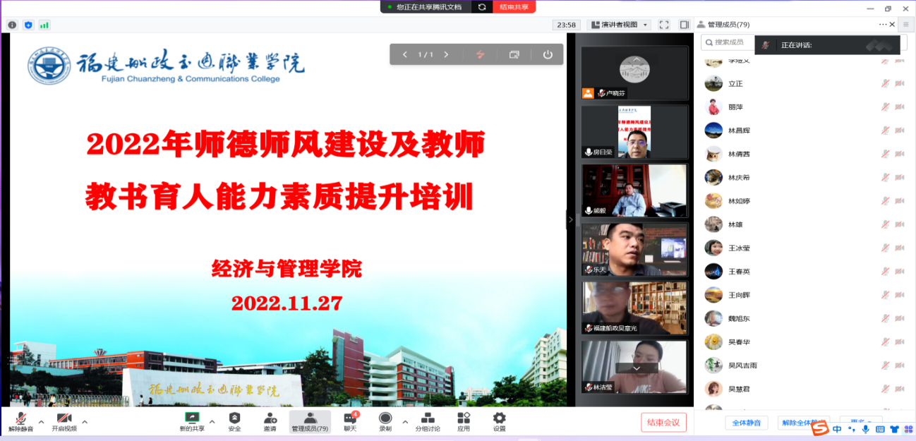 为加强我院教师队伍建设,促进教师专业成长,综合提升我院教师师德修养和能力水平,11月26至27日,我院举办2022年师德师风建设及教师教书育人能力素质提升培训。邀请了两位专家教授进行授课,吴丽芳教授,福建幼儿师范高等专科学校学前教育学院院长、首批国家级教学创新团队立项建设单位负责人、教育部职业院校教育类专业教学指导委员会委员,福建省杰出人民教师;熊毅教授,泉州经贸学院教务处处长、福建省名师、福建省教师教学创新团队负责人。经管学院全体专任教师、实验员、辅导员及其他学院老师参加本次培训。因疫情原因,本次培训通过线上形式进行,培训由房曰荣院长主持。