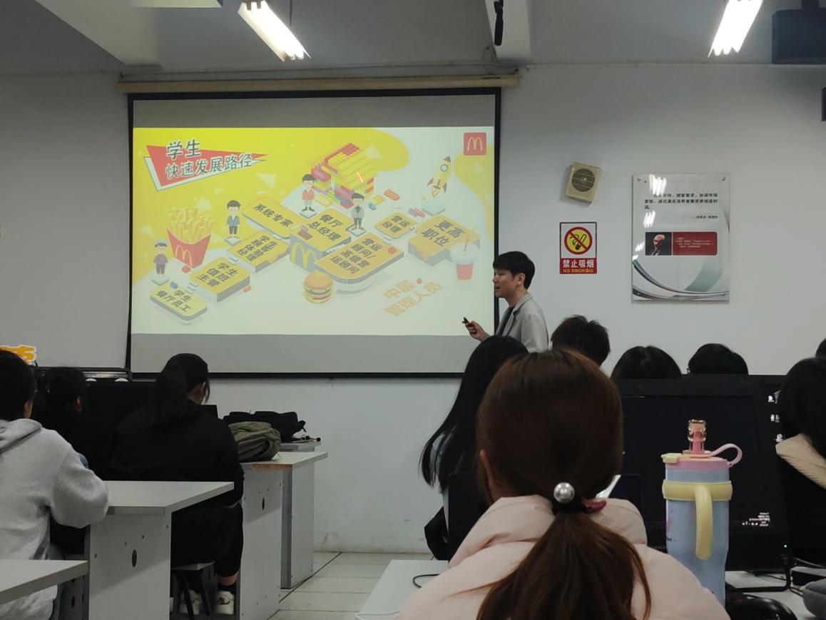 麦当劳招聘专员孔焰老师结合麦当劳人才培养体系,给同学上了一堂生动的《餐饮行业认知课》,解析零售行业对营销人才的能力要求,引导学生树立 “细节决定品质” 的职业意识。