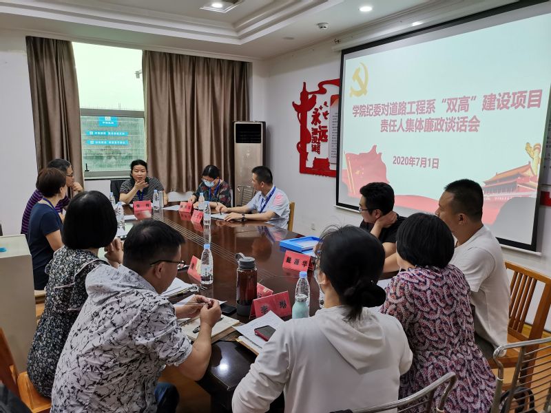 7月1日,适逢我们党成立99周年的日子。连续两天,学院党委委员、纪委书记张辉同志带领纪检监察处有关人员分别到道路工程系、安全技术与环境工程系,就做好“双高”建设和加强廉政建设开展集体廉政谈话。她强调要贯彻落实新时代党的组织路线,加强基层组织建设,发挥基层组织战斗堡垒作用,充分发调动广大党员在改革发展稳定中起先锋模范作用;她要求“双高”相关项目负责人一要提高政治站位,凝聚思想共识,二要遵规守纪,守好工作底线,三要强化责任意识,勇担当善作为,共谋学院事业再发展,再上新台阶。会上,道工系、安全系“双高”各建设项目负责人还签订了《廉政承诺书》。