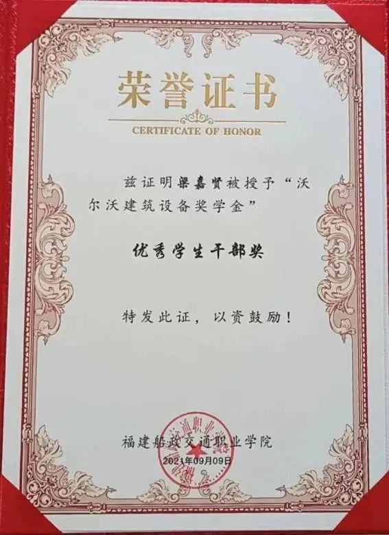 2、2021-2022年度,福建船政交通职业学院“一等奖学金”;