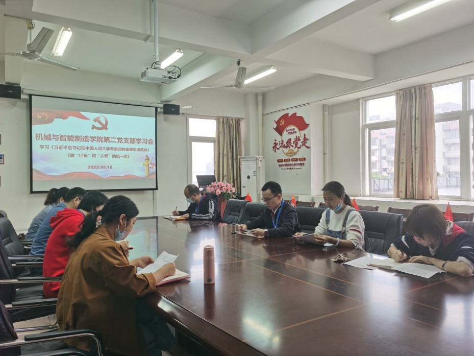2022年5月10日,机械与智能制造学院第二党支部召开支部学习大会,学习《习近平总书记在中国人民大学考察时的重要讲话精神(摘取)》、《做“经师”和“人师”的统一者》等文件精神。