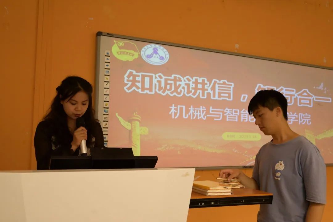 为深入贯彻落实习近平总书记关于教育的重要论述,落实立德树人根本任务,大力增强青年学生的诚信意识、责任意识和金融防诈骗意识,引导学生树立感恩诚信的价值观和科学理性的消费观,增强学生砥砺奋进的使命意识和责任担当。机械与智能制造学院于福道园2号楼1-1教室开展“知诚讲信,知行合一”知识竞答活动。
