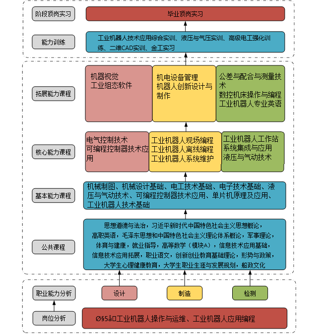 工业机器人综合系统的安装、调试与集成 | 1、电气元器件安装与接线 2、电气系统检测 3、控制系统调试 4、驱动系统调试 5、机电系统联调 5、工业机器人应用系统的调试与应用; 6、工业机器人工作站方案辅助设计 7、工业机器人工作站系统仿真辅助设计 8、对工业机器人自动化系统进行局部改造和升级。 | 对工业机器人工作站的设备进行设计、制造、安装、调试、集成、运行维护、设备管理及质量管理等。 | 1、具有分析工业机器人设备系统图的能力; 2、能够对工业机器人自动化生产线设备进行装配与调试; 3、能够对工业机器人自动化生产线设备进行维护; 4、具有对光、机、电、液设备的综合调试能力; 5、对工业机器人设备系统进行局部改造和升级的能力。 6、能正确使用各种测量器具; 7、具有沟通能力、团队协作能力、自我学习能力、信息检索与分析能力、创新能力。 | PLC可编程控制器的安装、编程与调试、单片机原理、自动化生产线的组装与调试、维修电工、工业机器人自动化生产线运行实习、工业机器人工作站的综合调试与应用。 |