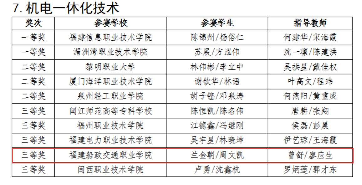 2023年12月23日-12月24日,福建省职业技能大赛“机电一体化”赛项在湄洲湾职业技术学院举办,来自全省的16支队伍参赛。支部党员廖应生老师和另一位指导老师曾舒老师指导的兰金朝、周文凯同学获得三等奖。