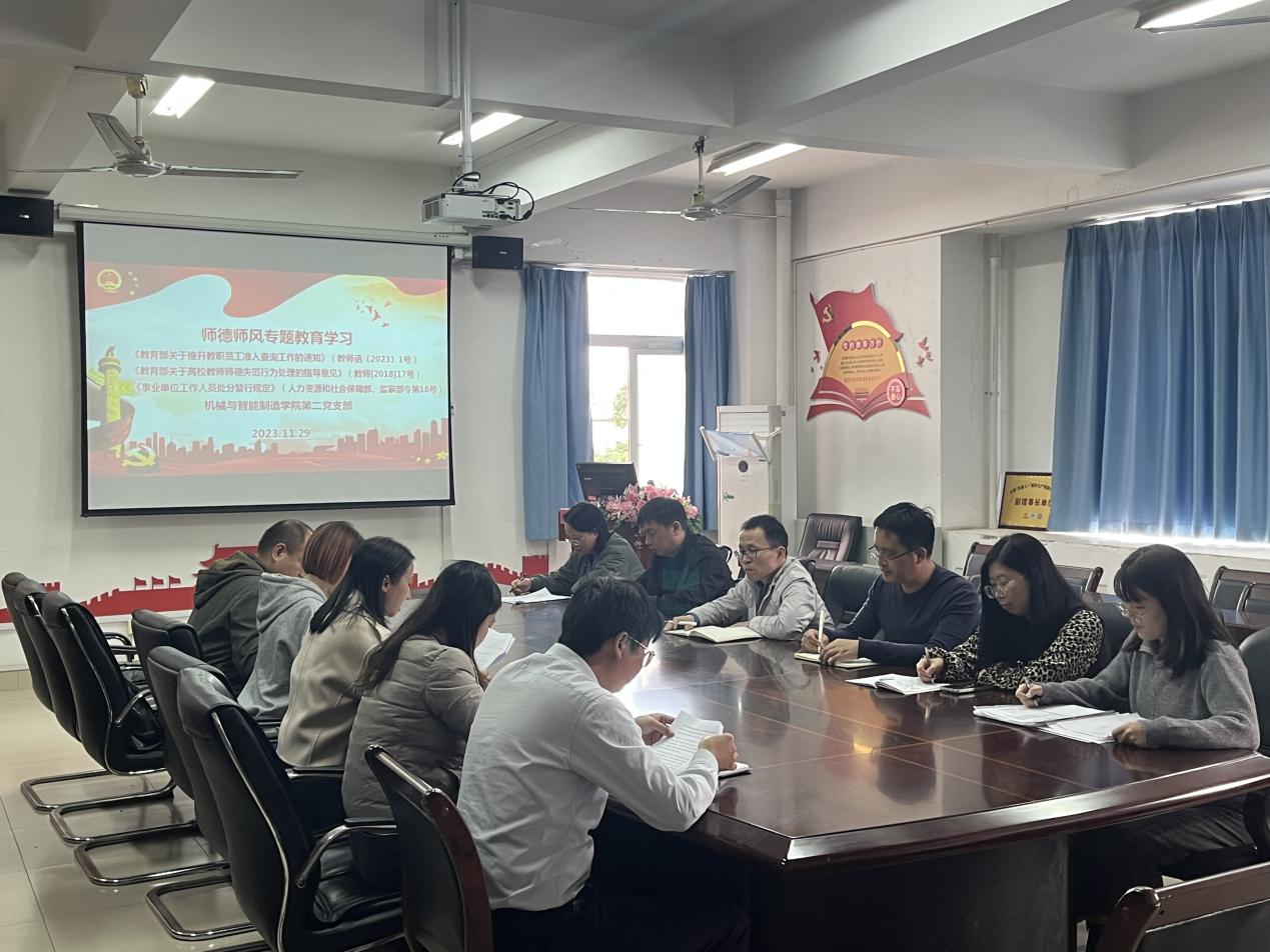2023年11月29日,机械与智能制造学院第二党支部开展师德师风学习教育活动,组织学习《教育部关于推开教职员工准入查询工作的通知》(教师函〔2023〕1号)、《教育部关于高校教师师德失范行为处理的指导意见》(教师[2018]17号)、《事业单位工作人员处分暂行规定》(人力资源和社会保障部、监察部令第18号)等文件精神。