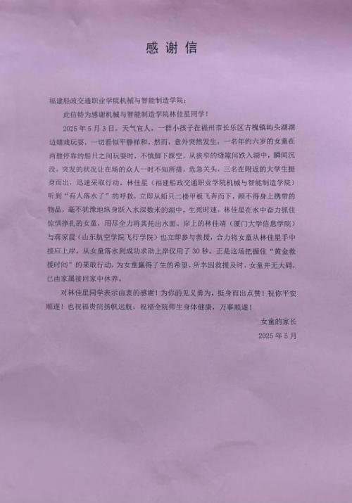 5月3日,福州市长乐区古槐镇屿头湖游船上一儿童脚下踩空,不慎落水。机械与智能制造学院2023级智能工程机械运用技术2班林佳星同学正在此游船上看风景,听到呼救声后,他立即挺身而出,毫不犹豫跳入湖中将落水的女童成功救起。