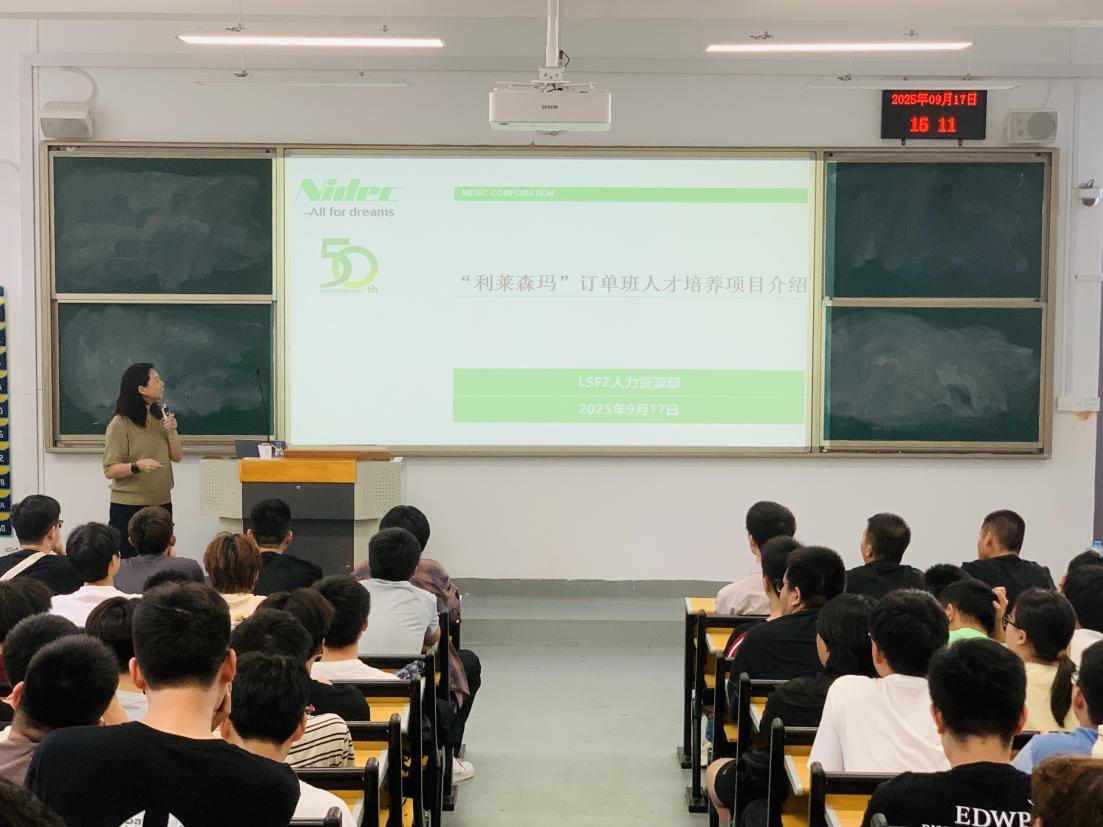订单班合作企业-利莱森玛电机科技(福州)有限公司企业人事经理代表企业上台发言。先是介绍了企业的发展历程、行业地位与核心业务,让新生对合作企业有了全面了解;接着,重点解读了电气专业订单班的培养体系,包括“校企共同制定人才培养方案”“学生进入企业实习实训”等特色环节,清晰展现了订单班“工学结合、精准育人”的优势,为新生提供了一条“入学即接轨职场”的成长通道。
