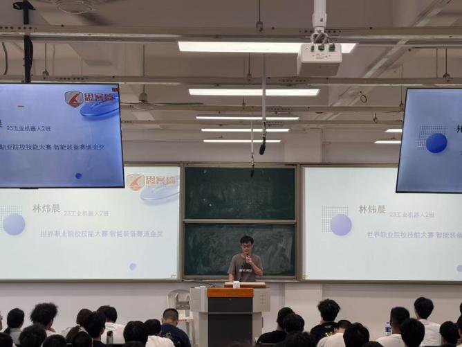 2025年世界技能大赛金奖获得者、我院23级工业机器人专业学生林炜晨分享了他的备赛历程与成长体会。他提到,在机器人竞赛团队中系统性的训练,包括编程、算法学习与机器人反复拆装等实战内容,不仅极大提升了其专业技能,更让他明确了职业方向。他鼓励新生充分了解学校提供的竞赛激励政策,积极参与课外兴趣小组,全面提升综合能力。