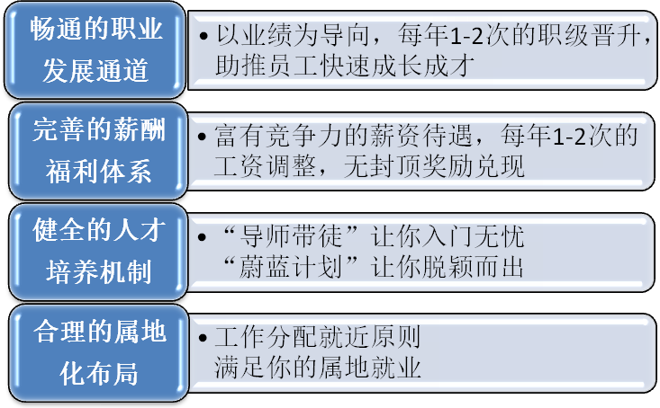 培训培养 | 入职培训、导师带徒、蔚蓝计划、e-Learning网络学习、内部培训、外送培训等 | |