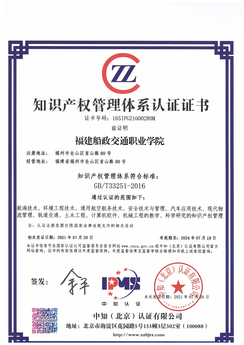 2021年,我校在全省高校率先开展贯彻GB/T33251-2016《高等学校知识产权管理规范》工作,并于2021年7月20日顺利通过中知(北京)认证有限公司认证审核,获得全省高校第一张认证证书(证书号:165IPG210002R0M),这得益于我校对国家标准的各项要求良好的贯彻落实,学校领导高度重视,各相关部门通力合作及承办部门严谨高效的工作。认证审核的通过标志着我校知识产权管理工作上了一个新台阶,提升了我校知识产权管理、运用水平,推动了学校科研能力、产学研能力的进一步提升。