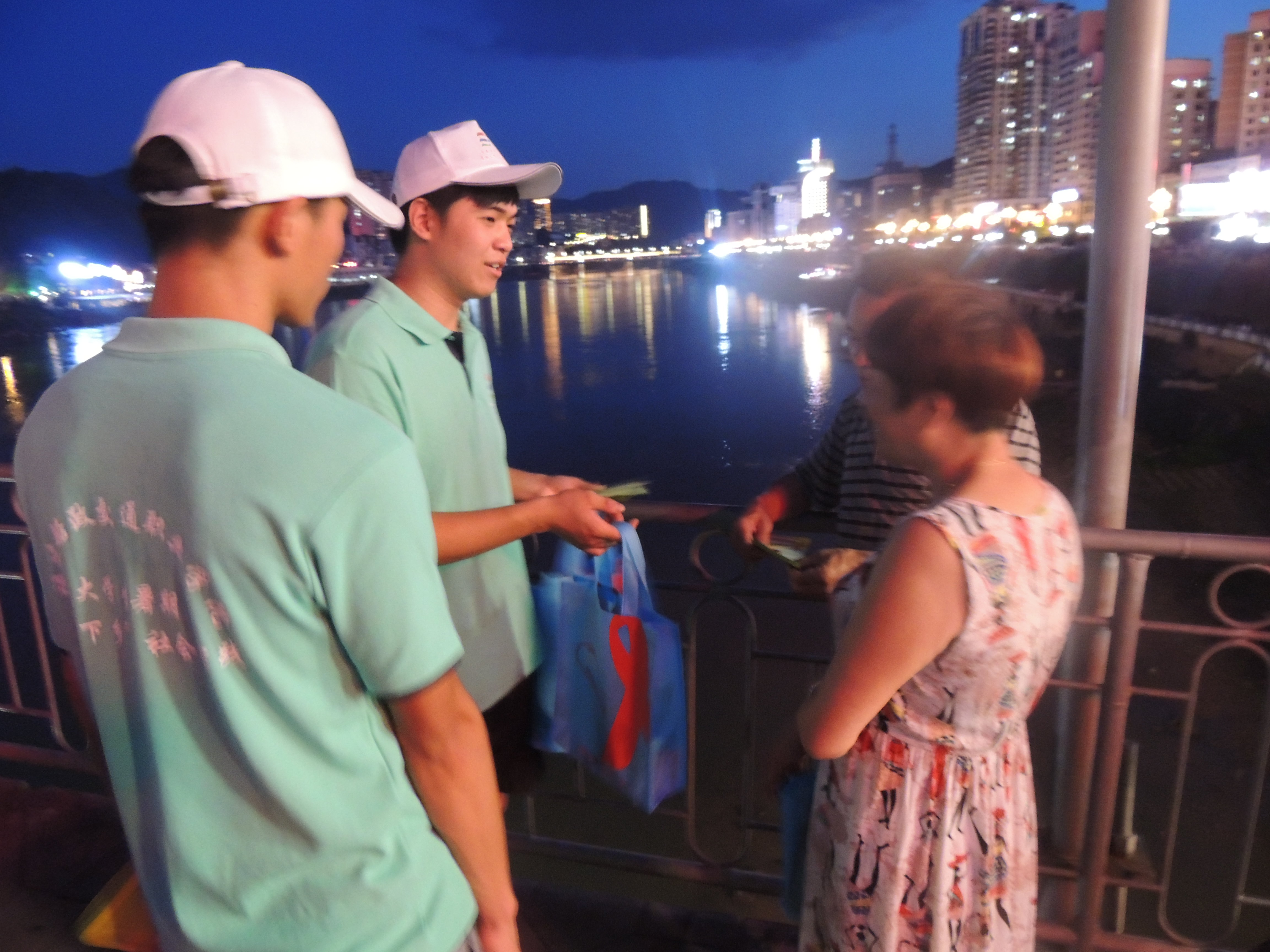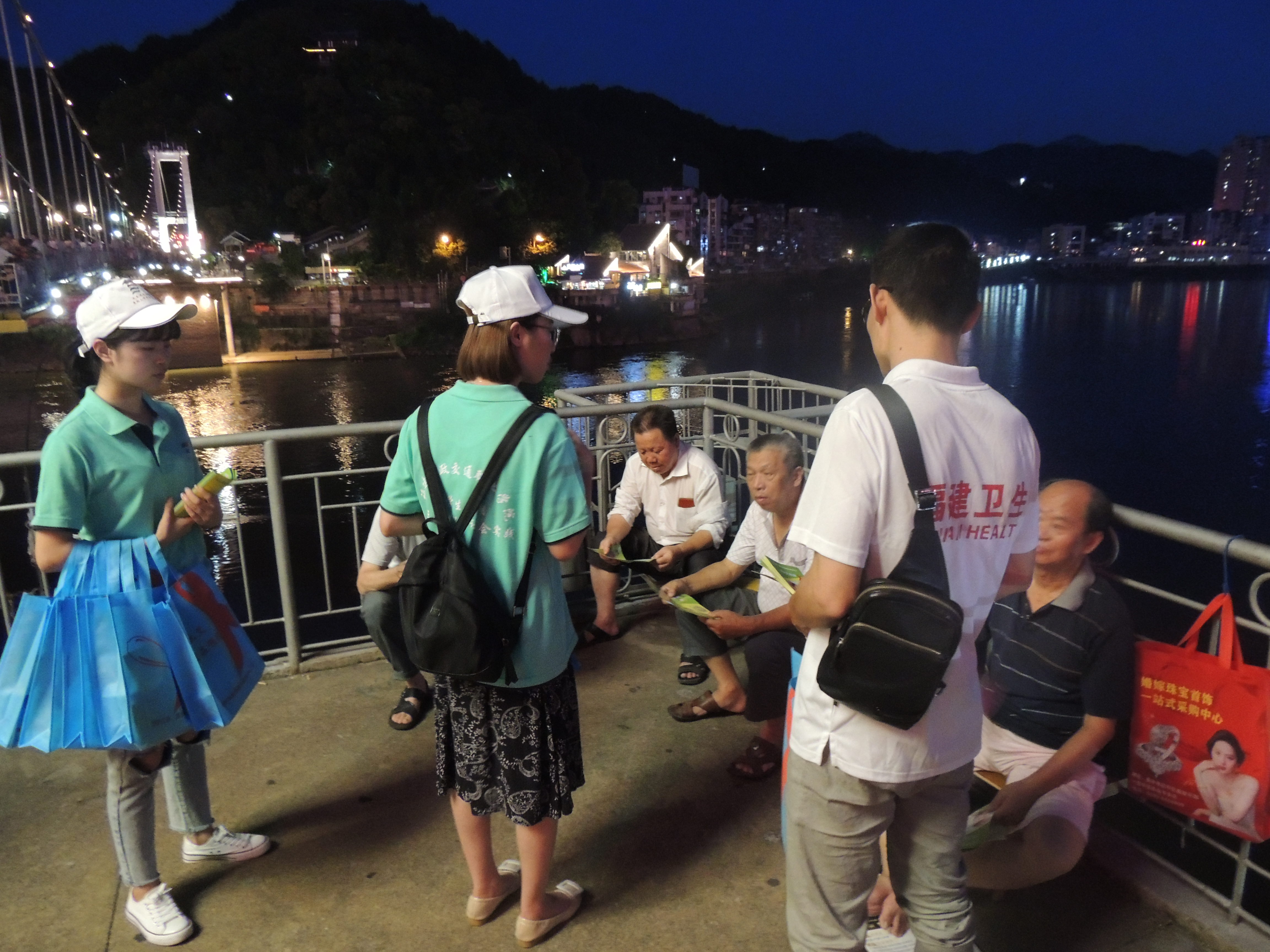 7月9日当天并同南平市疾病控制中心的科研室主任和数位医师及我们实践队领队沈晓家老师以及实践团的师生进行多点宣传。在疾控中心医师的防艾知识普及下,我们得知南平市艾滋发病率多在40岁以上的中老年人,我系宣传队根据这一特点,选择下午到傍晚在中老年人活动的密集区的公园、社区开展禁毒防艾的宣传活动。