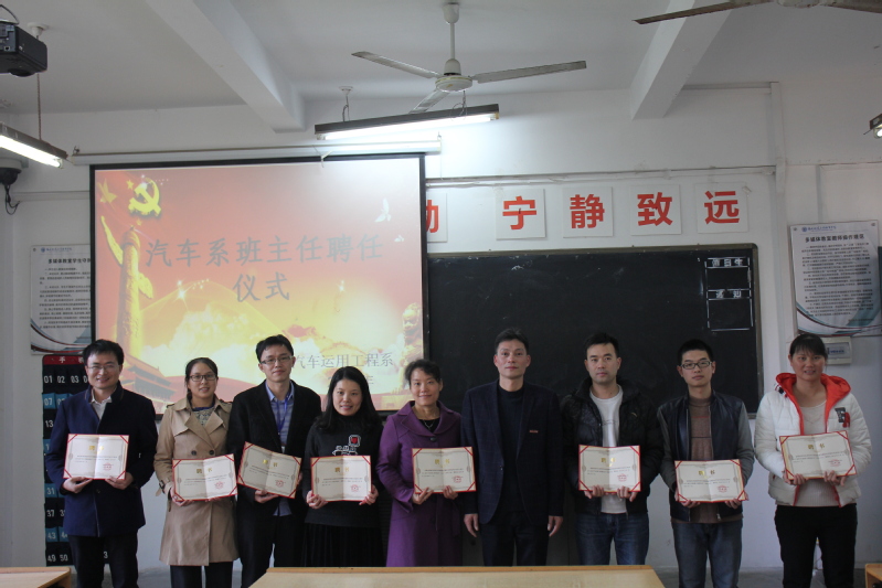 2018年12月26日,福建船政交通职业学院汽车运用工程系“2018级新生班级班主任聘任仪式”在北区22号楼汽西203教室隆重举行。汽车运用工程系党总支书记蔡华锦主持仪式,为今年新当选的18位班主任颁发聘书,并一同合影留念。